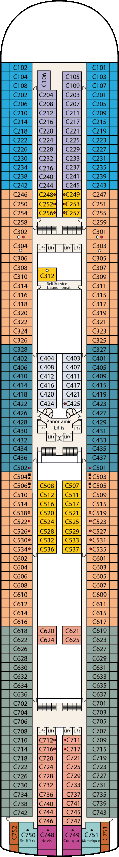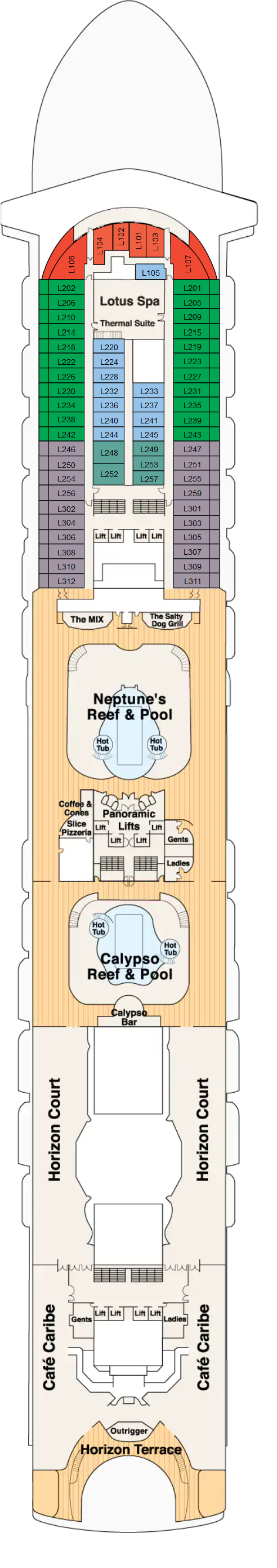 | Dekken: | Deck 12 - Aloha, Caribe dek, Deck 11 - Baja, Deck 9 - Dolphin, Deck 14 - Riviera | |