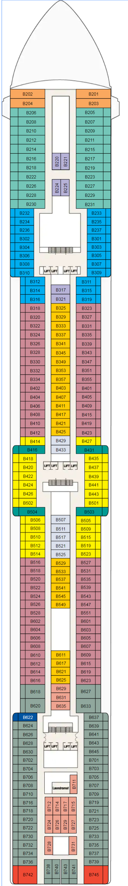 | Dekken: | Deck 14 - Lido, Deck 12 - Aloha, Deck 11 - Baja, Deck 10 - Caribe, Deck 9 - Dolphin, Deck 8 - Emerald, Deck 7 - Promenade | |