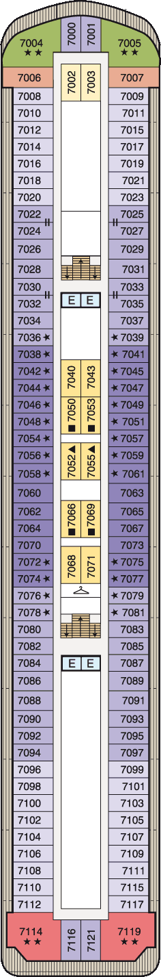 | Beschrijving: | ca. 73 vierkante meter | Teakhouten balkon met hoogwaardige lounge-meubels | Slaapkamer met 1 queen size bed en Flatscreen TV | Badkamer met bubbelbad, toilet | 42" Flatscreen TV met Bose® surround sound systeem | Flatscreen-TV | Entertainment systeem | Kluis | 24-uurs butler service | Bar met geselecteerde sterkedrank en wijn | Strijkservice bij inscheping | Gratis toegang tot de Spa | |